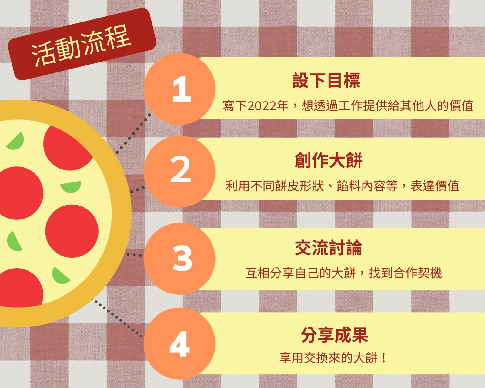 #交流活動 #創意 Pizza 虎唬生風大餅節(已結束) 你的願景大餅,有人想吃嗎? 說好的大餅,積極實踐了嗎? 《虎虎生風大餅節》 讓你說完大餅,就做大餅! 並與他人分享交流2022年的目標 動手吧!找到共創大餅的機會! 大餅實踐價(含食材) NT$ 888 /人 報名去 >>