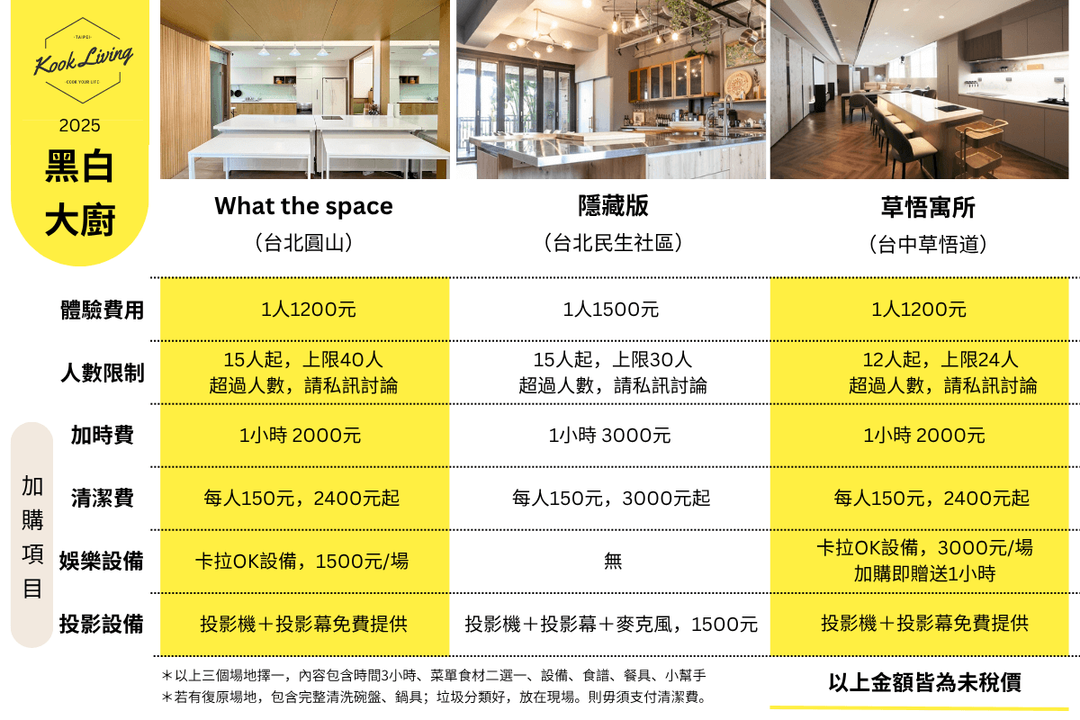 開始預訂 從選場地開始 What the space-黑白大廚:誰是我的神隊友2025 搶時段包場 3 小時 由 What the space 立即預約 隱藏版-黑白大廚:誰是我的神隊友 2025 搶時段包場,1人1500起 3 小時 立即預約 草悟寓所-黑白大廚:誰是我的神隊友 2025 搶時段包場,每人1200起 3 小時 由 草悟寓所 立即預約