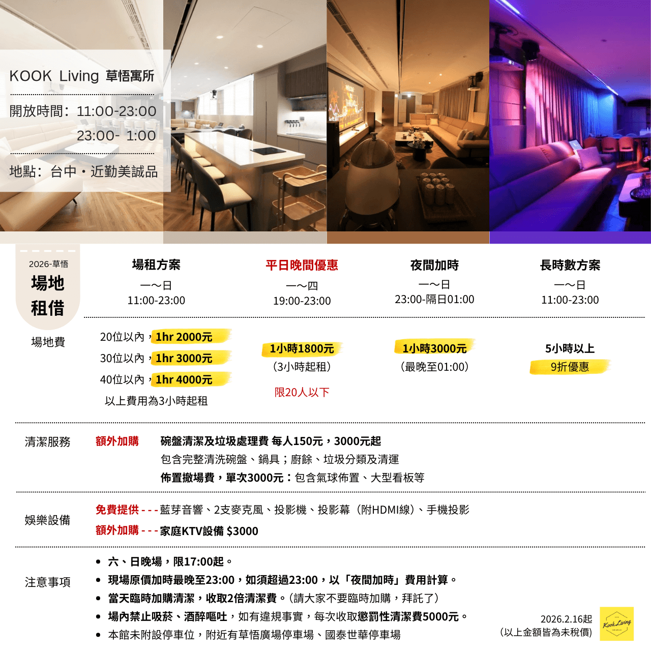 其他共享廚房場地 像邀請朋友到家中作客,聚餐也能自在又舒服 台中北屯|小聚場 空間大小:大包廂38坪+小包廂14坪 人數上限:70人 地點:近台中北屯 台北西門|小小的家 空間大小:15坪 人數上限:上限14人 地點:近捷運西門站,走路5分鐘 台北圓山|What the sapce 空間大小:40坪 人數上限:40人 地點:近捷運圓山站,走路7分鐘