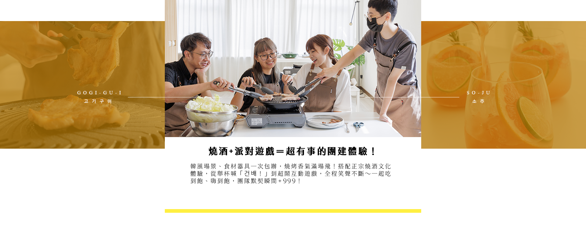 韓風場景、食材器具一次包辦,燒烤香氣滿場飛!搭配正宗燒酒文化體驗,從舉杯喊「건배!」到超鬧互動遊戲,全程笑聲不斷~一起吃到飽、嗨到飽,團隊默契瞬間+999!